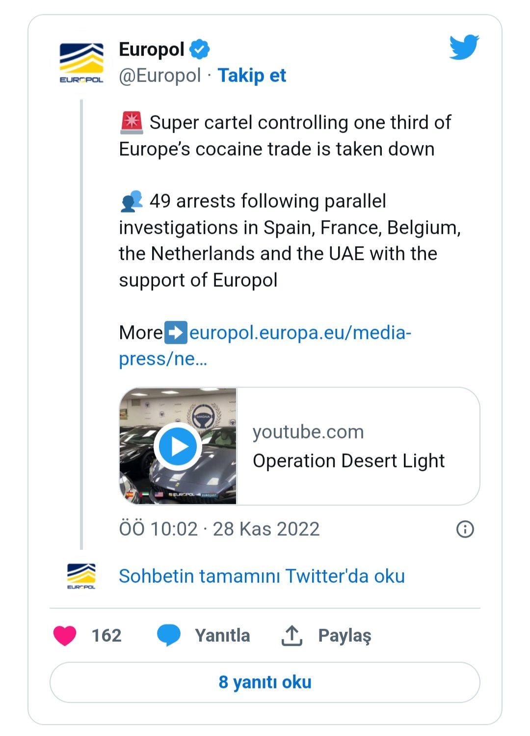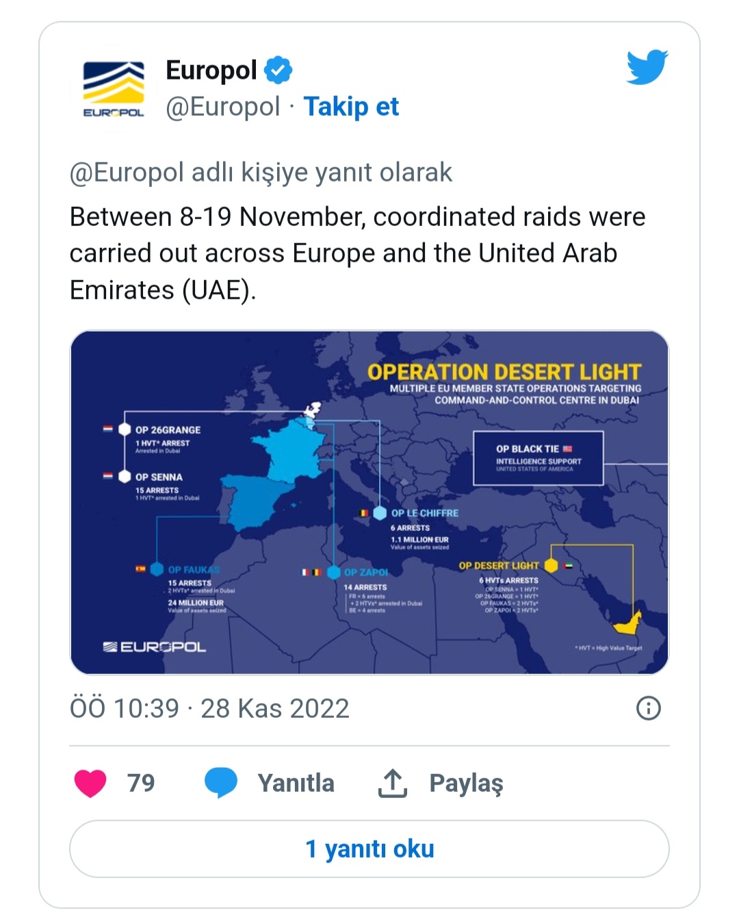 Teşkilat, "Çöl Işığı Operasyonu"na katılan polis güçlerinin hem "komuta ve kontrol merkezini hem de Avrupa'daki lojistik uyuşturucu kaçakçılığı altyapısını" hedef aldığını söyledi.