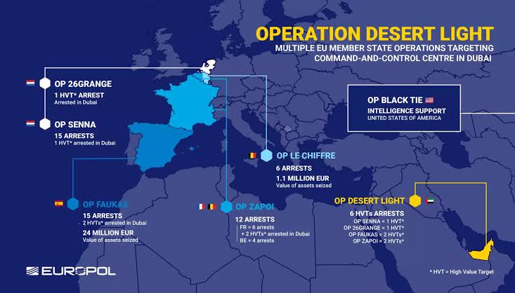 Europol, 8-19 Kasım tarihleri arasında Avrupa ve Birleşik Arap Emirlikleri'nde gerçekleştirilen son bir dizi baskınla birlikte soruşturma sırasında 49 şüphelinin tutuklandığını söyledi.