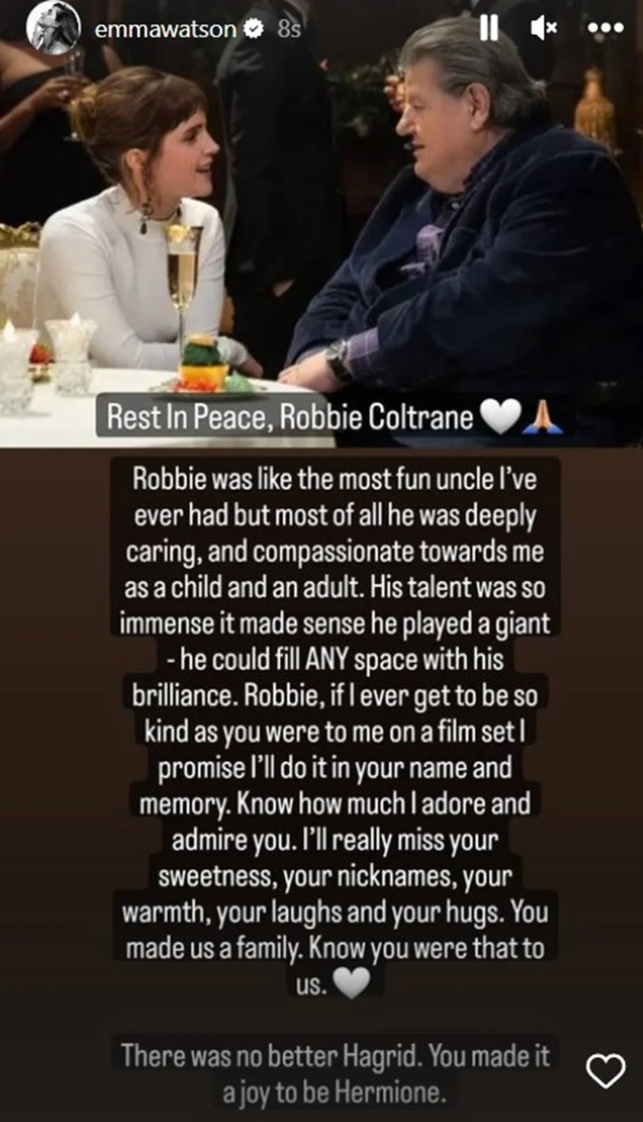 Ölüm haberi sevenlerini üzdü ve hemen sosyal medyada gündem oldu. Harry Potter filminde önemli role sahip olan karakterlerden biri olan Emma Watson, Coltrane’la olan fotoğrafını paylaşarak şu cümleleri hikayesinde paylaştı: “Huzur içinde uyu Robbie Coltrane.