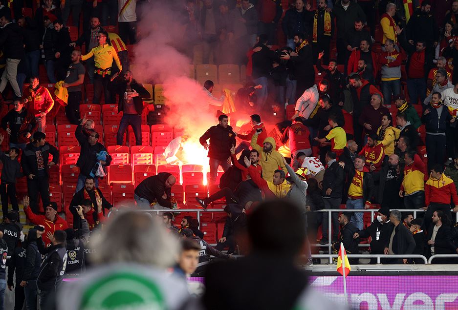 Göztepe-Altay derbisinde alana giren bir taraftar, korner direğini yerinden sökerek Altay kalecisi Ozan Evrim Özen’e saldırdı. Hücumun akabinde müsabaka tatil edildi. Hastaneye kaldırılan kalecinin şuurunun açık olduğu bildirildi.