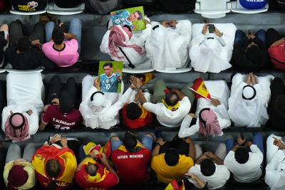 Katar, Al Khor'daki Al Bayt Stadyumu'nda İspanya ile Almanya arasında oynanan Dünya Kupası E grubu futbol maçı sırasında tribünlerde Forman Alman uluslararası Mesut Özil'in fotoğraflarını tutuyor.