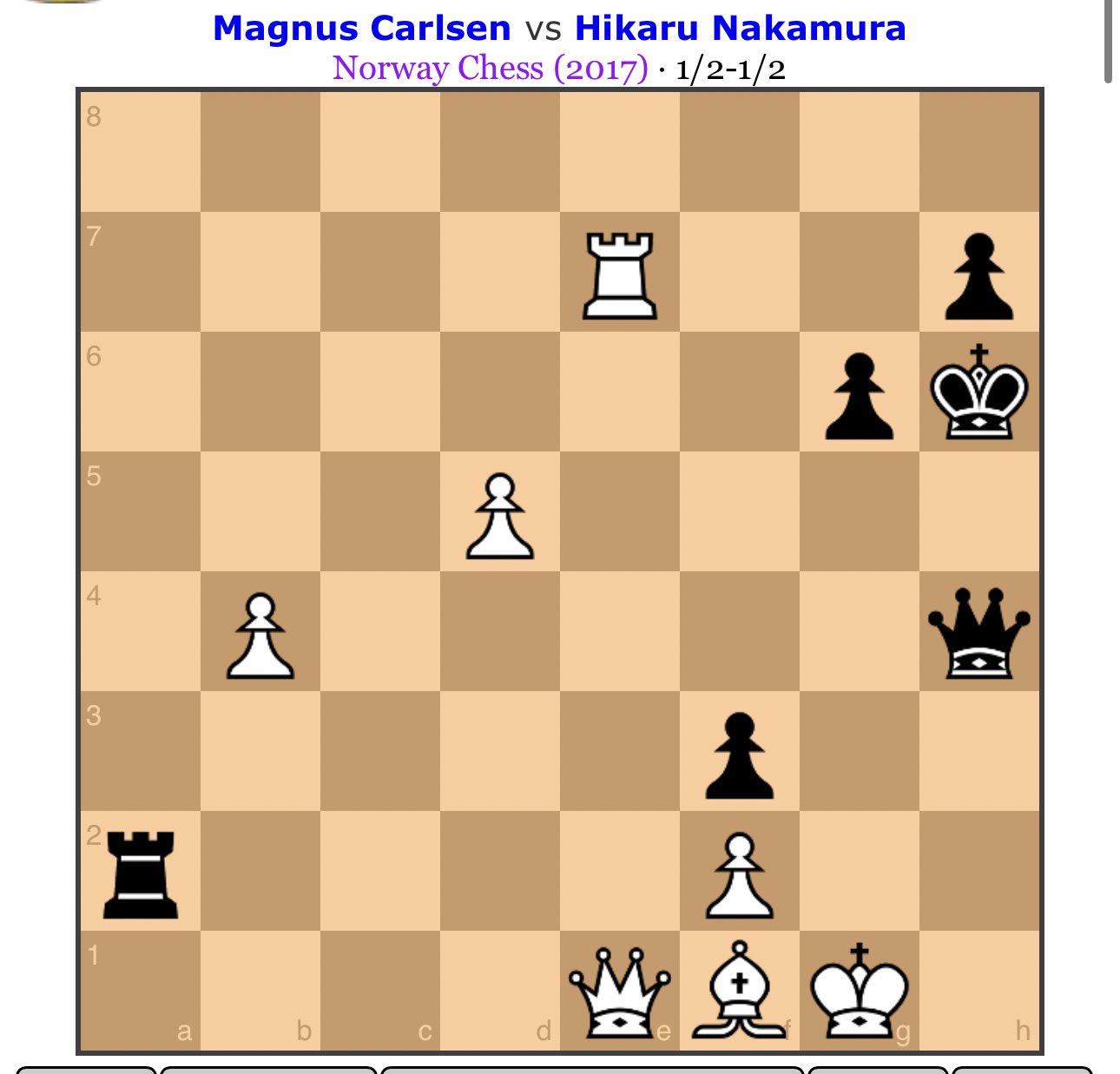 Fotoğraftaki satranç pozisyonu satrancın Ronaldo ve Messi’si; Magnus Carlsen ve Hikaru Nakamura’nın 2017’de berabere kaldığı karşılaşmadan alındığı görüldü.