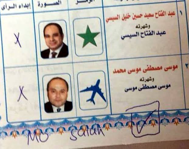 Mısır'daki 2018 cumhurbaşkanlığı seçimlerinde, bir milyondan fazla kişi, Muhammed Salah'a oy vermek için Sisi ve Moussa adlı iki adayın adının üstünü çizdi ve Salah'ın adını oy pusulasına yazdı. Yasal oy olarak sayılmış olsaydı, Salah seçim yarışını ikinci sırada bitirecekti!