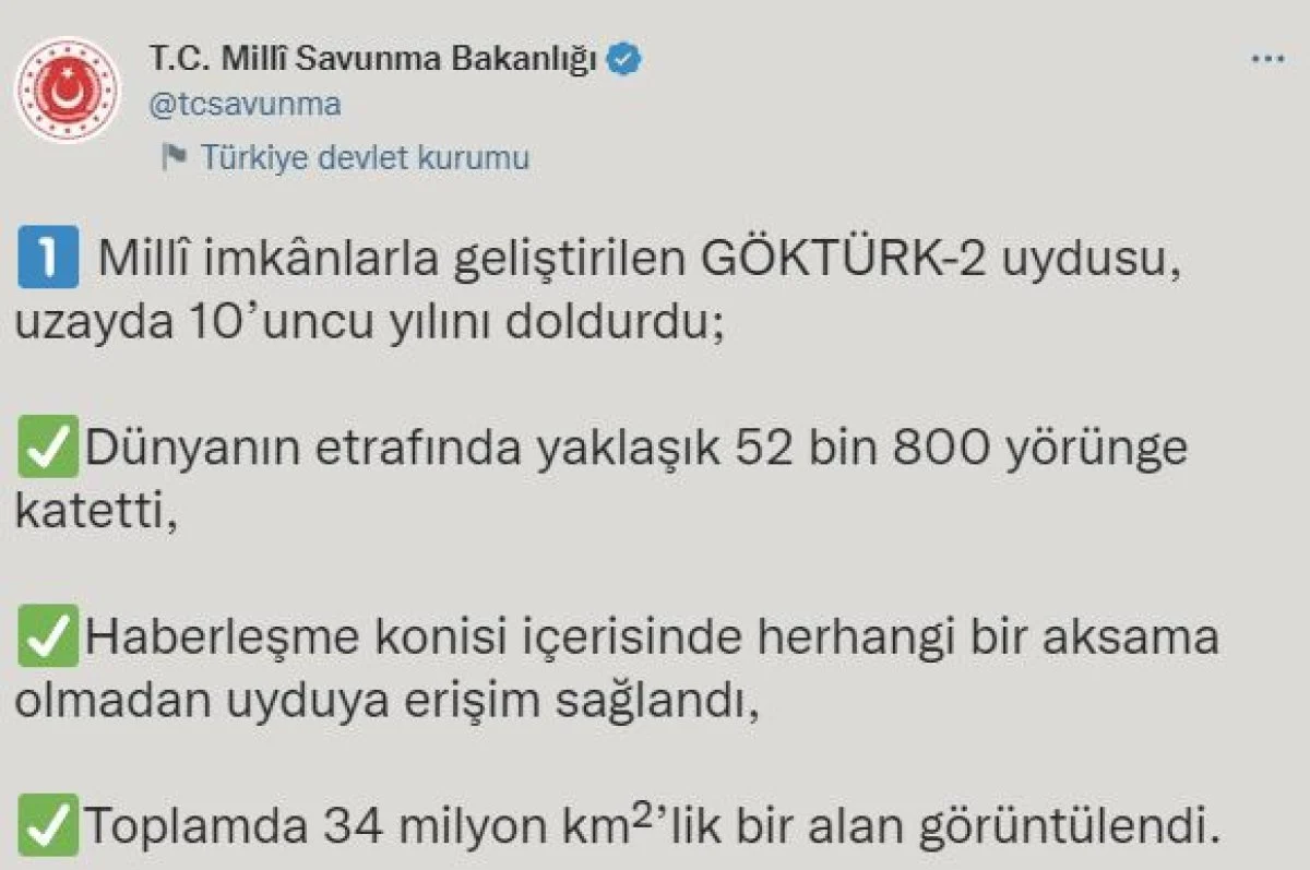 Göktürk-2, 10 yıllık görevi boyunca dünyanın etrafında yaklaşık 52 bin 800 yörünge kat etti.