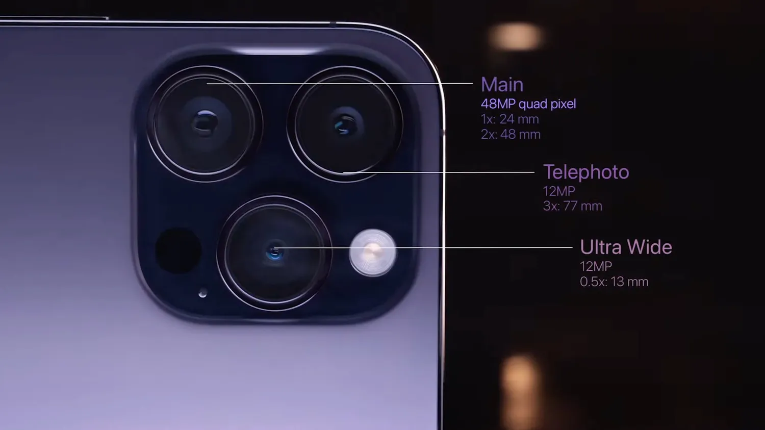 iPhone 14 Pro Max’te lensler daha da büyüdü; geniş, telefoto, ultra geniş lenste önemli iyileştirmeler, geliştirmeler söz konusu. Geniş kameradan başlayacak olursak, iPhone 13 Pro Max’te kullanılan 12 megapiksel kamera yerini Sony yapımı, odak piksel (focus pixel) ve piksel gruplama özelliğine sahip 48 megapiksel geniş kameraya bıraktı. Daha büyük megapiksel sayısıyla, pikseller de küçüldü. Apple’ın odak pikselleri adını verdiği çift pixel otomatik odaklama sistemi, 60fps 16:9 video kaydına imkan veriyor. iPhone 14 Pro serisi, iPhone 13 Pro'ya kıyasla %65 daha büyük sensör ile geliyor.